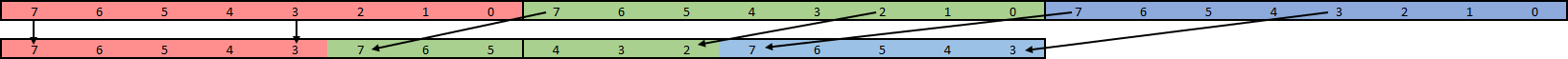 L'image ci-dessous montre où chaque bit d'un pixel place avec cette conversion. Chaque case en gras représente un octet. Chaque cellule numérotée est un bit dans la couleur donnée.