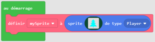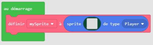Pour coder l'exemple ci-dessous, aller dans Avancé → Extension et sélectionner Jeu pour ajouter les menus SPRITES, CONTRÔLEUR, SCENE et INFO. Puis sélectionner le bloc “Créer” dans SPRITES.