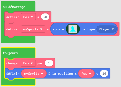 Nous allons créer une variable Pos et l'initialiser avec la valeur 50 puis nous l'incrémenterons dans une boucle. L’arbre se déplacera alors d'une position : 51, 52, 53, 54, 55… etc. À un moment donné, l'arbre se déplacera en dehors de l'écran.