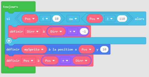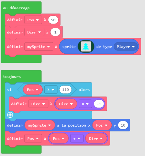 Pour que le sprite se déplace latéralement à l'écran, on peut utiliser un test pour vérifier “si” l'arbre a atteint le bord, puis inverser le déplacement. Étant donné que la largeur de l'écran est de 128 pixels, on vérifie que la position de l'arbre est inférieure à 110. Le moyen le plus simple consiste à contrôler sa direction par une valeur positive lorsqu'il se déplace à droite et négative lorsqu'il se déplace à gauche. Appelons cette variable Dirr.