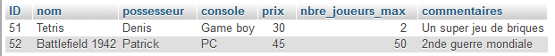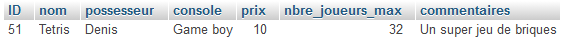 Résultat dans phpMyAdmin : modification de l'entrée 51