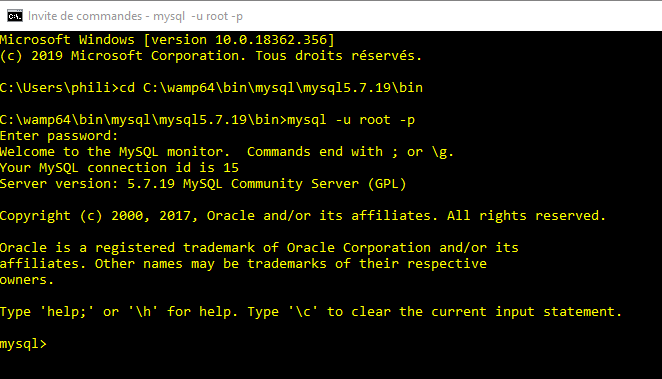 - Se connecter avec la commande : mysql -u root -p (utilisateur root et pas de mot de passe)