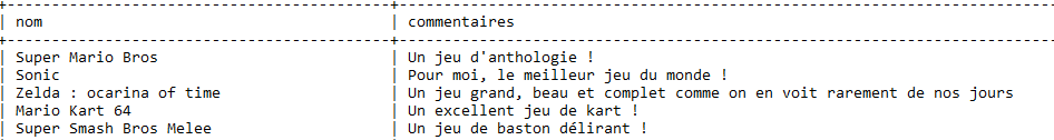 SELECT nom, commentaires FROM jeux_video;