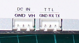 Le câblage est très simple. En regardant la base de l’imprimante on voit deux connexions. À gauche, l'alimentation et à droite les données . Les câbles sont fournis avec l’imprimante. <note>Notez que vous avez besoin d’une alimentation externe capable de fournir une tension comprise entre 5 et 9 volts et un courant de 1,5 ampères. En veille, l’imprimante consomme moins de 10 milliampères, mais lors de l’impression, elle nécessite jusqu'à 1,47 A.</note>