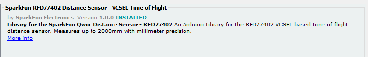 - → Fichier → Exemples → SparkFun RFD77402 Distance Sensor - VCSEL Time of Flight → Example1-BasicReadings.ino