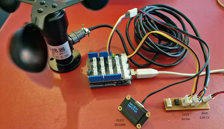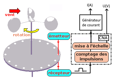 - L'anémomètre délivre une impulsion par tour (une vitesse de 2,4 km/h donne une impulsion par seconde).