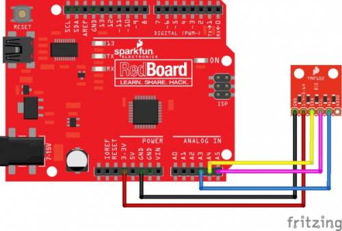 Le TMP102 de Texas Instruments est un capteur de température numérique.Il transmet la température mesurée par un bus I2C. Sa résolution est égale à 0,0625°C et sa précision 0,5°C. Le module intégre des résistances de tirage de 4,7 kΩ et fonctionne entre 1,4 V et 3,6 V.