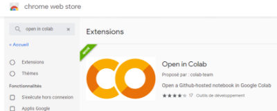• Installer l'application Open in Colab dans le navigateur à partir de chrome web store pour qu'elle soit disponible dans .