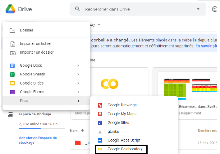 Pour utiliser Google colab il suffit d'aller sur son compte google drive, de cliquer sur nouveau et sur “plus” afin de choisir “Colaboratory”.