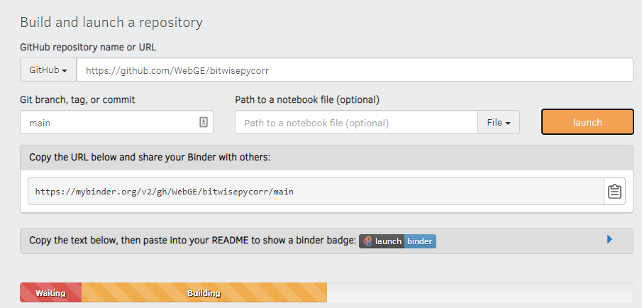 3. Ouvrir mybinder.org et placer le nom ou URL du référentiel GitHub.