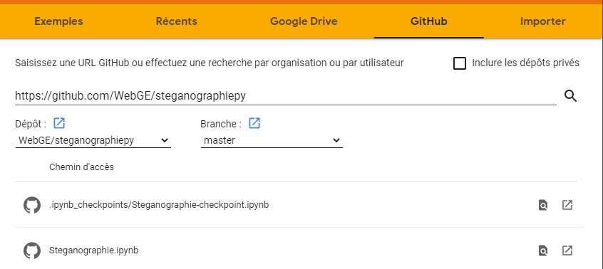 • Sélectionner Github dans Open in Colab et entrer le lien vers le dépôt.