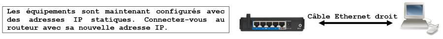 Pour le moment, seuls le routeur et le PC sont connectés. Les manipulations décrites ci-dessous vont vous permettre de configurer le réseau avec les adresses IP statiques que vous avez choisies.