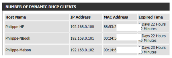 Vous pouvez connaître l’adresse IP dynamique, le masque de sous réseau et l’adresse Mac de chacun des hôtes connectés au DIR-600 (avec une IP dynamique) en consultant la page « NETWORK SETTING » du menu « SETUP ». Les « hôtes » ayant été connectés sont listés comme dans l’exemple ci-dessous.