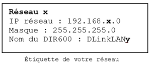 Lors de la première mise sous tension ou après un reset (action pendant 20s minimum sur le bouton RESET à l’arrière du boitier) le routeur DIR-600 est configuré avec l’adresse IP notée dessous. Il met en œuvre le protocole DHCP pour attribuer automatiquement des adresses IP (dynamiques) aux hôtes du réseau.