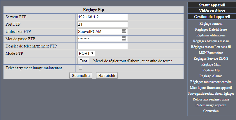 - Sélectionner Gestion de l'appareil → Réglage FTP puis paramétrer la liaison avec