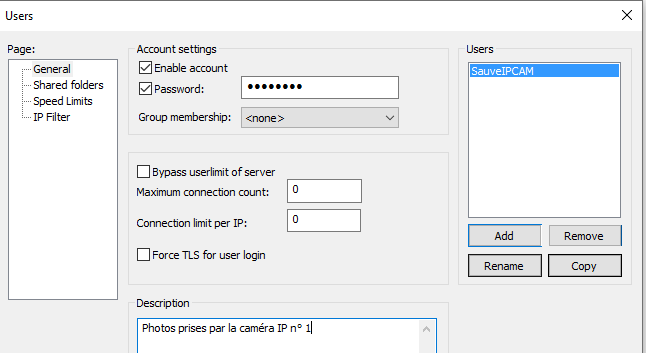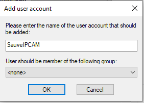 - Cliquer sur Add et entrer le nom du compte. Exemple : le nom de la caméra.