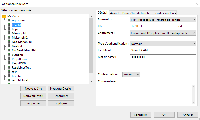 - Paramétrer la connexion à FileZilla comme sur la copie d'écran ci-dessous.