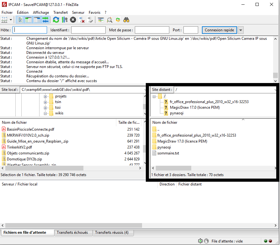 - Cliquer sur Connexion. Autoriser la connexion non sécurisée. La zone “site distant” doit présenter les fichiers contenus dans le répertoire sélectionné par FileZilla Server.