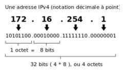 Il existe des adresses IP de version 4 (sur 32 bits, soit 4 octets) et de version 6 (sur 128 bits, soit 16 octets). La version 4 est actuellement la plus utilisée : elle est généralement représentée en notation décimale avec quatre nombres compris entre 0 et 255, séparés par des points, ce qui donne par exemple : 212.85.150.134. Les plages d'adresses IPv4 étant proches de la saturation, les opérateurs incitent à la transition d'IPv4 vers IPv6. Wikipédia