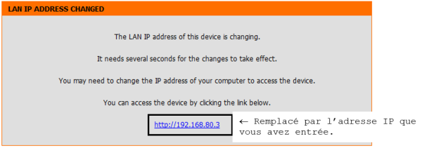 Pour vous connecter au routeur avec sa nouvelle adresse IP, vous devez reconfigurer la carte Ethernet du PC en IP fixe (Annexe 2). En plus des champs “Adresse IP” et “Masque de sous réseau”, vous devez renseigner la passerelle par défaut (avec l’IP du routeur).