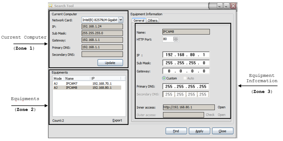 (2) Pour connaître les informations de connexion d’une caméra : la sélectionner dans la liste de la zone 2 « Equipments ». L’adresse IP de la caméra et le masque de sous-réseau apparaissent dans la zone 3 « Equipment Information »