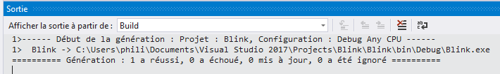 Dans l'éditeur, sélectionner : Générer → Générer la solution ou [Ctrl+Maj+B]. S'il n’y a pas d’erreurs dans le code le logiciel indique :