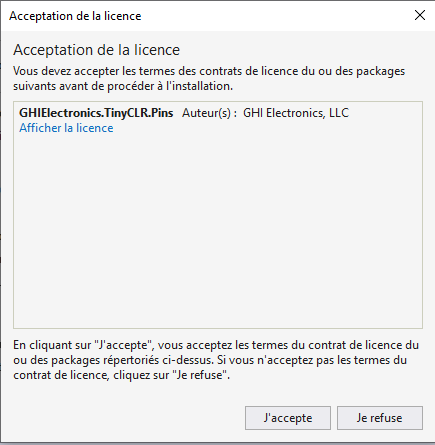 • Cliquer sur GHIElectronics.TinyCLR.Pins puis “Installer” pour placer les bibliothèques dans le projet.