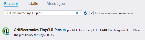 • Se placer dans l'onglet “Parcourir” et entrer GHIElectronics.TinyCLR.pins .