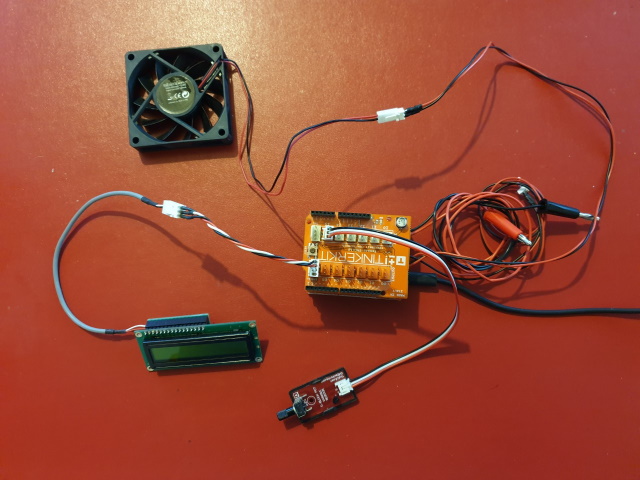 Cahier des charges du programme 3 : régler la vitesse d'un ventilateur entre 0 et 100% de sa valeur maximum à partir de la mesure de la position de l'axe d'un potentiomètre. Afficher le réglage sur un LCD